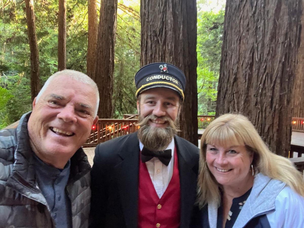 Donna and her husband are greeted by the Skunk Train conductor. In the early 1880s, lumbermen C.R. Johnson, Calvin Stewart, and James Hunter joined together to expand timber operations in Mendocino County. By 1885 the Fort Bragg Railroad was formed to make transporting lumber easier. This would form the foundation of what would eventually become the California Western Railroad, more commonly known as The Skunk.