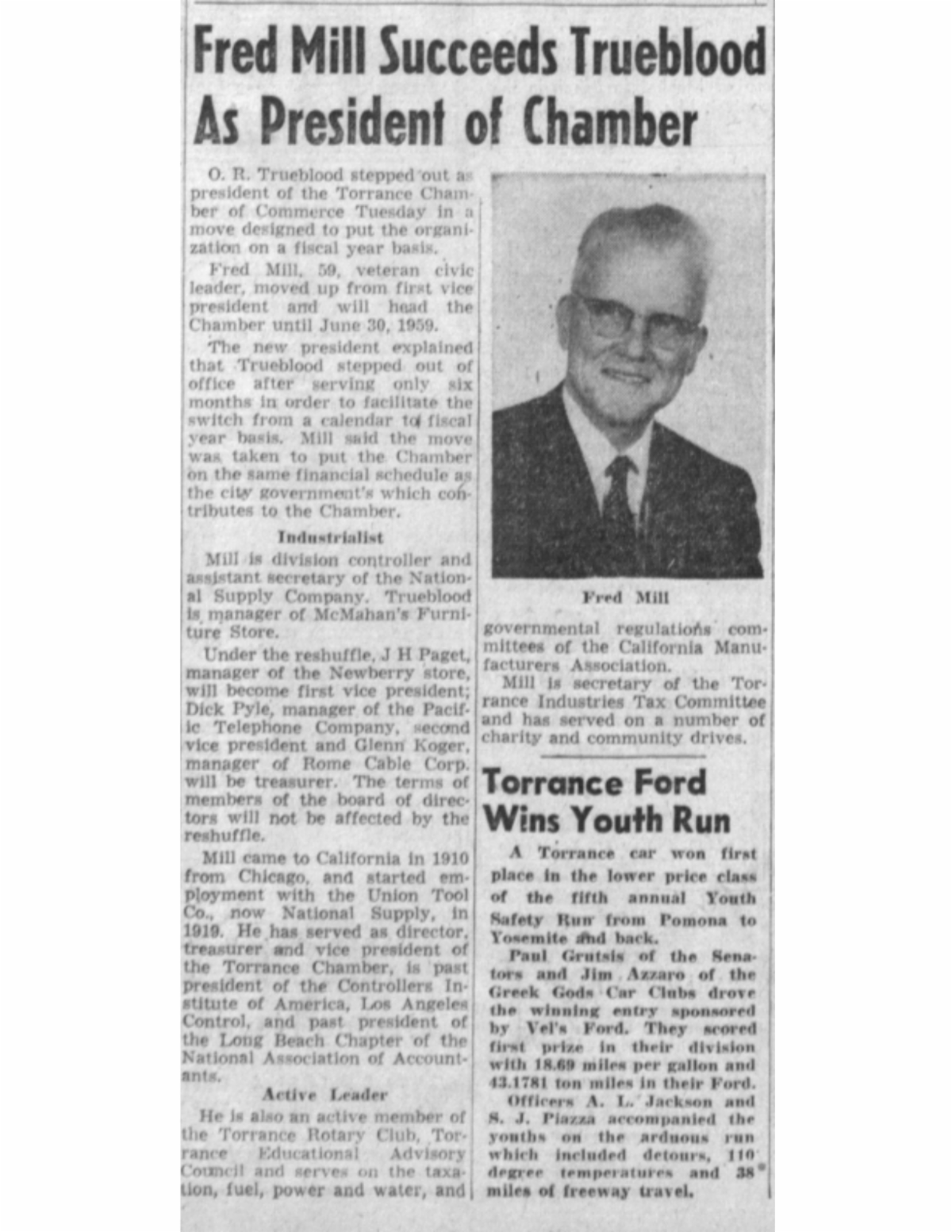 O.R. Trueblood stepped out as president of the Torrance Chamber of Commerce Tuesday in a move designed to put the organization on a fiscal year basis. Fred Mill, 59, veteran civic leader, moved up from first vice president and will head the Chamber until June 30, 1959.