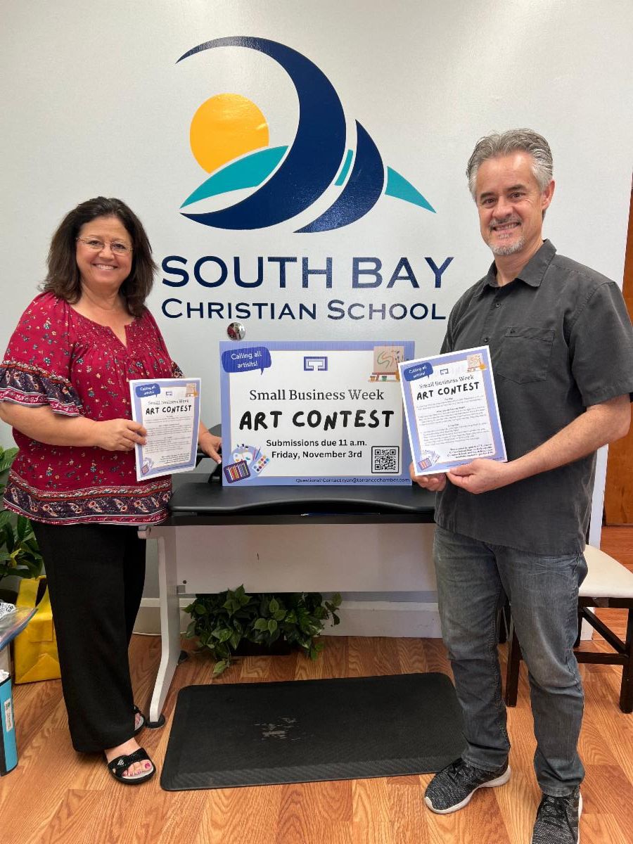 Darolyn Jensen and Paul Marcondes receive flyers for the 2023 Small Business Week Art Contest at South Bay Junior Academy. | |