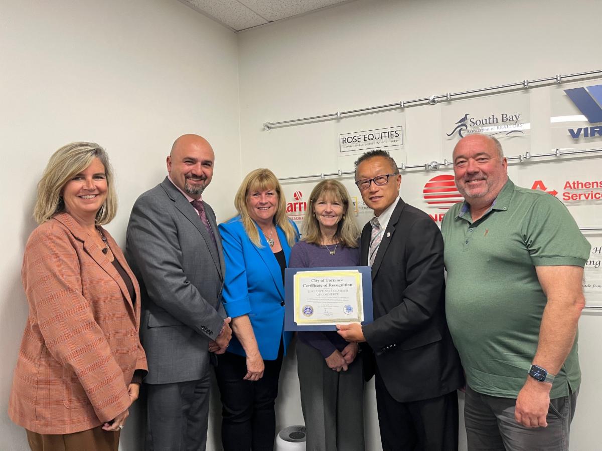 The Torrance Area Chamber of Commerce received a Certificate of Recognition from the City of Torrance for the 2024 Advocacy Champion Award. This recognition acknowledges our unwavering service and significant impact on the Torrance Area business community. We are honored by this acknowledgment and remain dedicated to advocating for local businesses. Pictured from left to right: Fran Fulton, City of Torrance, Economic Development Manager; Aram Chaparyan, City of Torrance, City Manager; Donna Duperron, President & CEO; Sherry Kramer, Chairwoman of the Board; George Chen, City of Torrance, Mayor; and Larry Halvorsen, Vice Chair Government Relations. | |