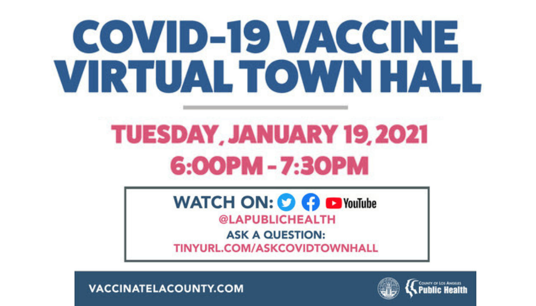 Get the latest updates on the COVID-19 Vaccine today Tuesday, January 19, 2021 from 6:00-7:30 pm! Tonight's panel discussion will be moderated by Dr. Hector Flores, Chairman of the Department of Family Medicine at White Memorial Medical Center featuring Dr. Eloisa Gonzalez, Director of Cardiovascular and School Health, Los Angeles County Department of Public Health, Dr. Paul Simon, Chief Science Officer, Los Angeles County Department of Public Health, and Dr. Seira Kurian, Director of the Division of Medical Affairs, Los Angeles County Department of Public Health. You can watch on Twitter, Facebook, or YouTube. Ask a question at tinyurl.com/askcovidtownhall.
