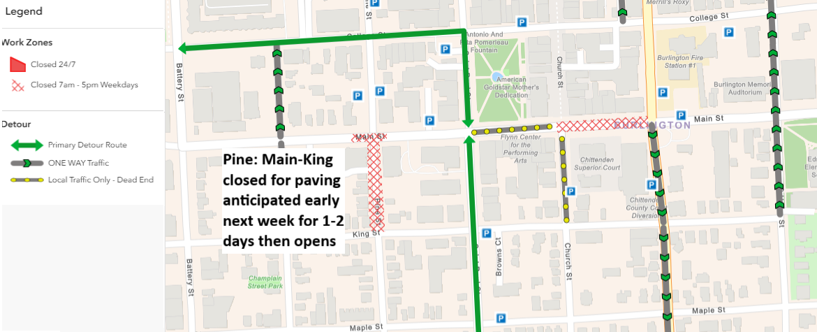 | | No paving activities will take place tomorrow, Friday, October 17, along Pine Street between Main Street and Kilburn Street. The remaining paving activities have been rescheduled to the week of October 20. Tomorrow, Friday, October 17, crews will focus on prepping the King Street and Pine Street intersection and Main Street and Pine Street intersection for paving as well as sidewalk installation at the Maple Street and Pine Street intersection. Intermittent traffic restrictions will be in place at these intersections, but traffic will be maintained. | | CHAMPLAIN PARKWAY & MAIN STREET GREAT STREETS HIGHLIGHTS: | | The Burlington Department of Public Works maintains a construction map containing traffic impacts, including traffic restrictions, roadway closures, and more, for all major construction projects in the Downtown District and the South End. Plan your travel with the most up-to-date information by using the map here. | | |