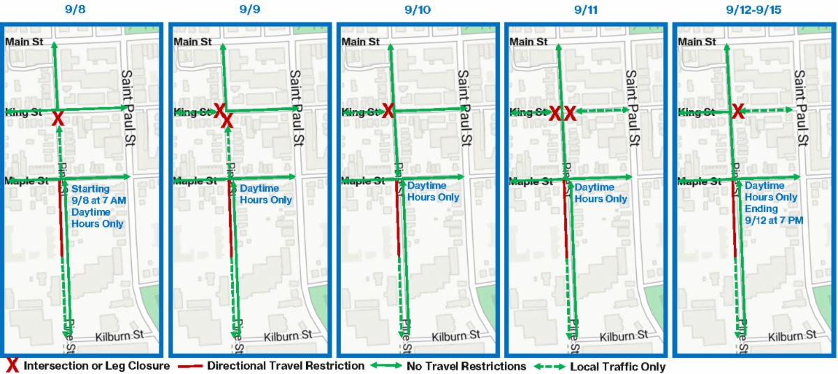 Pine Street – King Street to Maple Street: Monday, 9/8, at 7 AM through Tuesday, 9/9, at 7 PM, Pine Street between King Street and Maple Street will be restricted to local traffic only and only accessible via Maple Street.