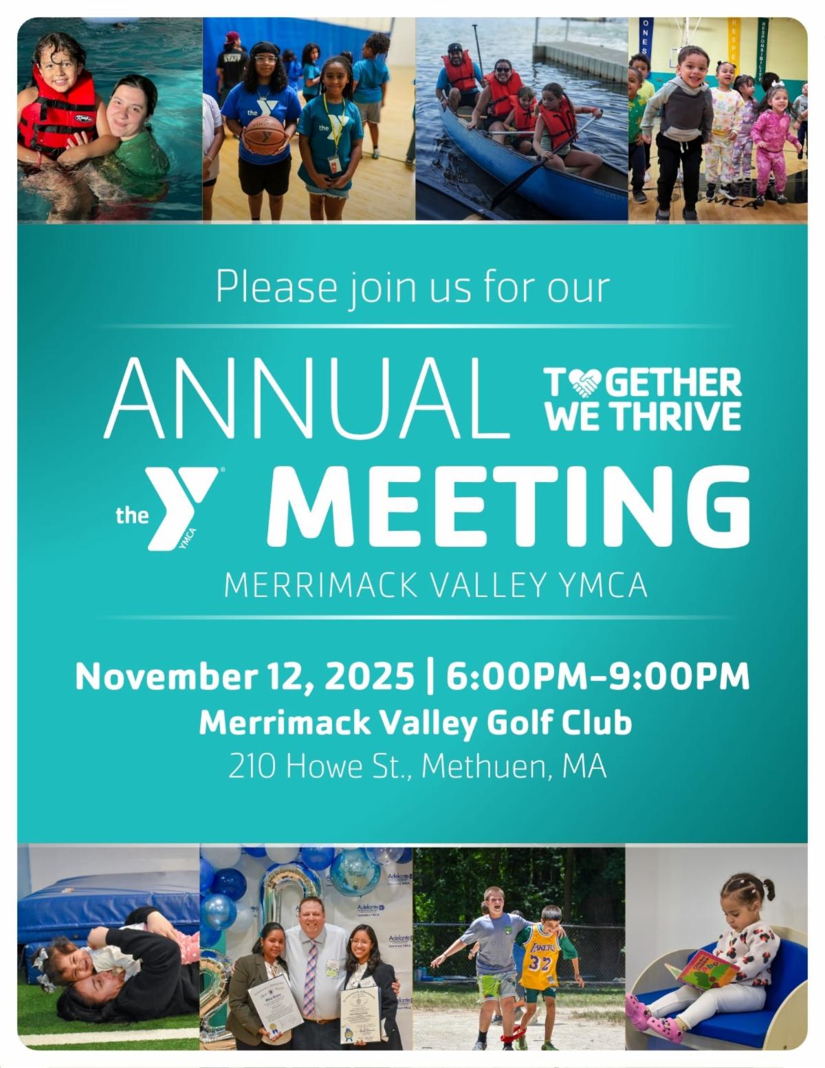 "Join us for an evening of celebration and community building as we honor the impact and efforts of your YMCA in the Merrimack Valley. This annual meeting is a time to come together, reflect on the past year, and recognize the positive changes we’ve made as a community. It’s a celebration of everyone who has contributed to making a difference, and we look forward to acknowledging all that we’ve accomplished together."