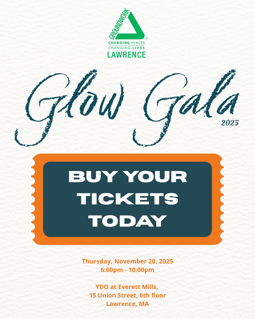 "Join us for an inspiring evening at our annual Glow Gala! Since 1999, Groundwork Lawrence has been making positive change happen in Lawrence, Massachusetts. Our mission is to regenerate and improve the physical environment through strong community partnerships that empower people, businesses, and organizations to advance environmental, economic, and social well-being. The Glow Gala is our special opportunity to celebrate the progress we’ve made together—transforming green spaces, building healthier futures, and expanding educational opportunities for Lawrence youth. Come celebrate with us as we honor the achievements of our community, reflect on the impact of our work, and look ahead to an even brighter future together!"