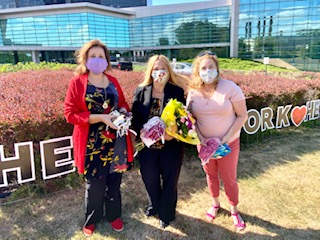 Stony Brook Stichers, Jan Tassie, left, and Melissa Shampine, right, pictured with Carol Gomes, Chief Executive Officer/Chief Operating Officer in front Stony Brook Medicine
