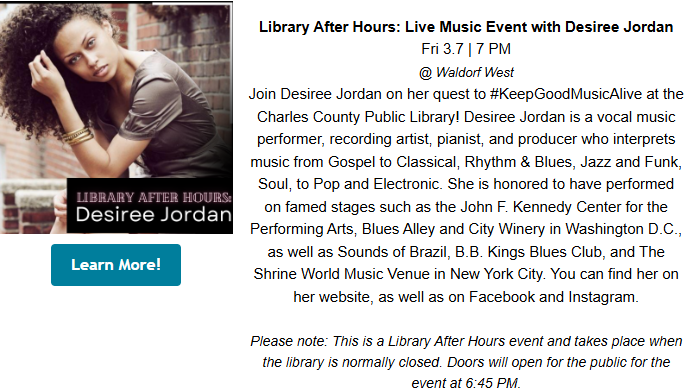 The mission of the Charles County Arts Alliance (CCAA) is to stimulate, promote, encourage, and provide recognition of the arts and the creative spirit. Founded in 1987, the CCAA promotes ALL the arts in Charles County: music, visual art, drama, dance and literature.