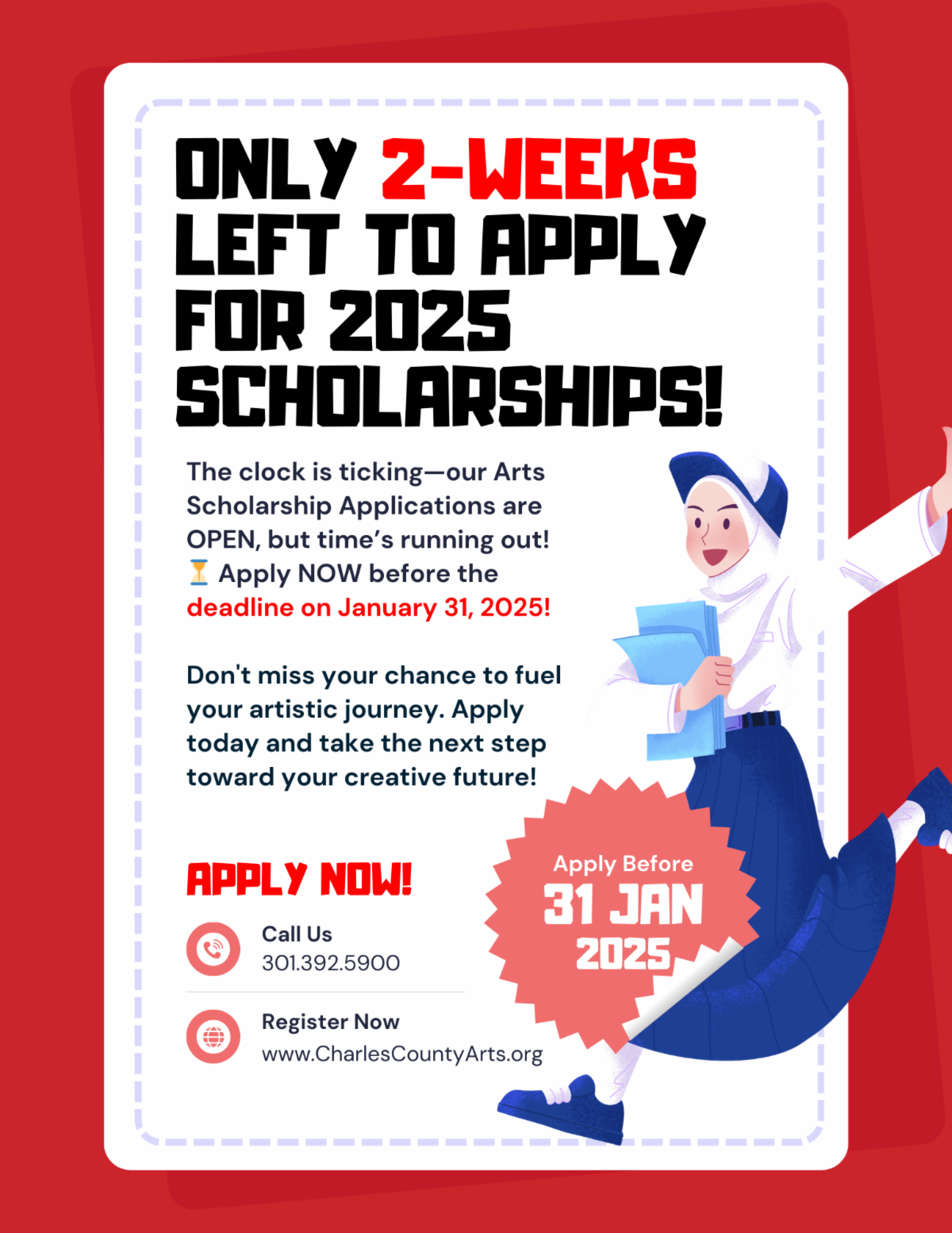 The mission of the Charles County Arts Alliance (CCAA) is to stimulate, promote, encourage, and provide recognition of the arts and the creative spirit. Founded in 1987, the CCAA promotes ALL the arts in Charles County: music, visual art, drama, dance and literature.