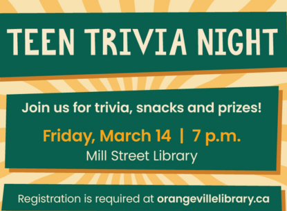 The Teen Advisory Group (TAG) hosts their ever popular Trivia Night during the March Break. Open for teens 13 to 17. Grab a friend and register for this fun filled and competitive event. Tasty snacks and laughs included.