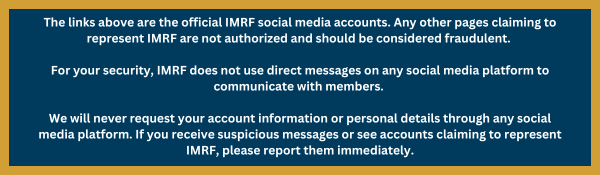 | | Please do not reply to this message. Replies to this message will not be read or responded to. Please visit our website to create a Member Access account and connect with IMRF. To ensure our emails reach your inbox, please add "newsletter@imrf.org" to your address book. Update your email address through Member Access. | | | | | |