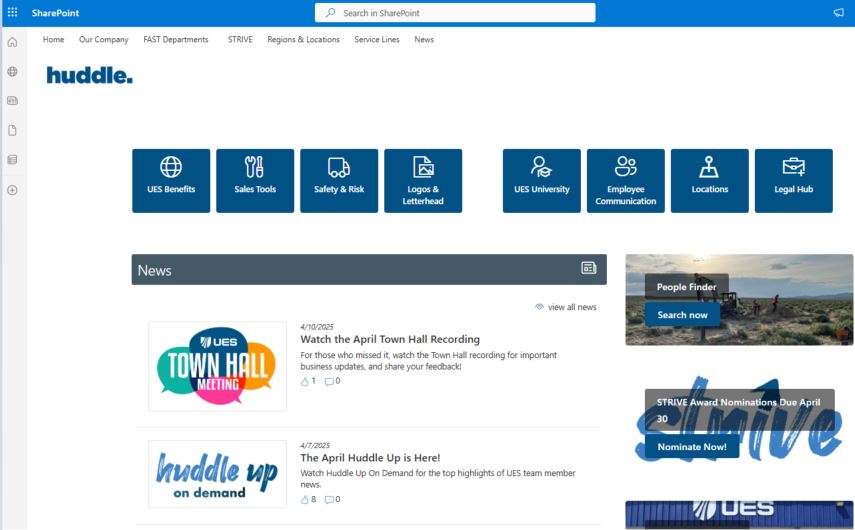 On the homepage, you can keep up with company news, use the People Finder to find contact information of fellow UES team members, and submit a STRIVE Shout Out to a teammate for a job well done!