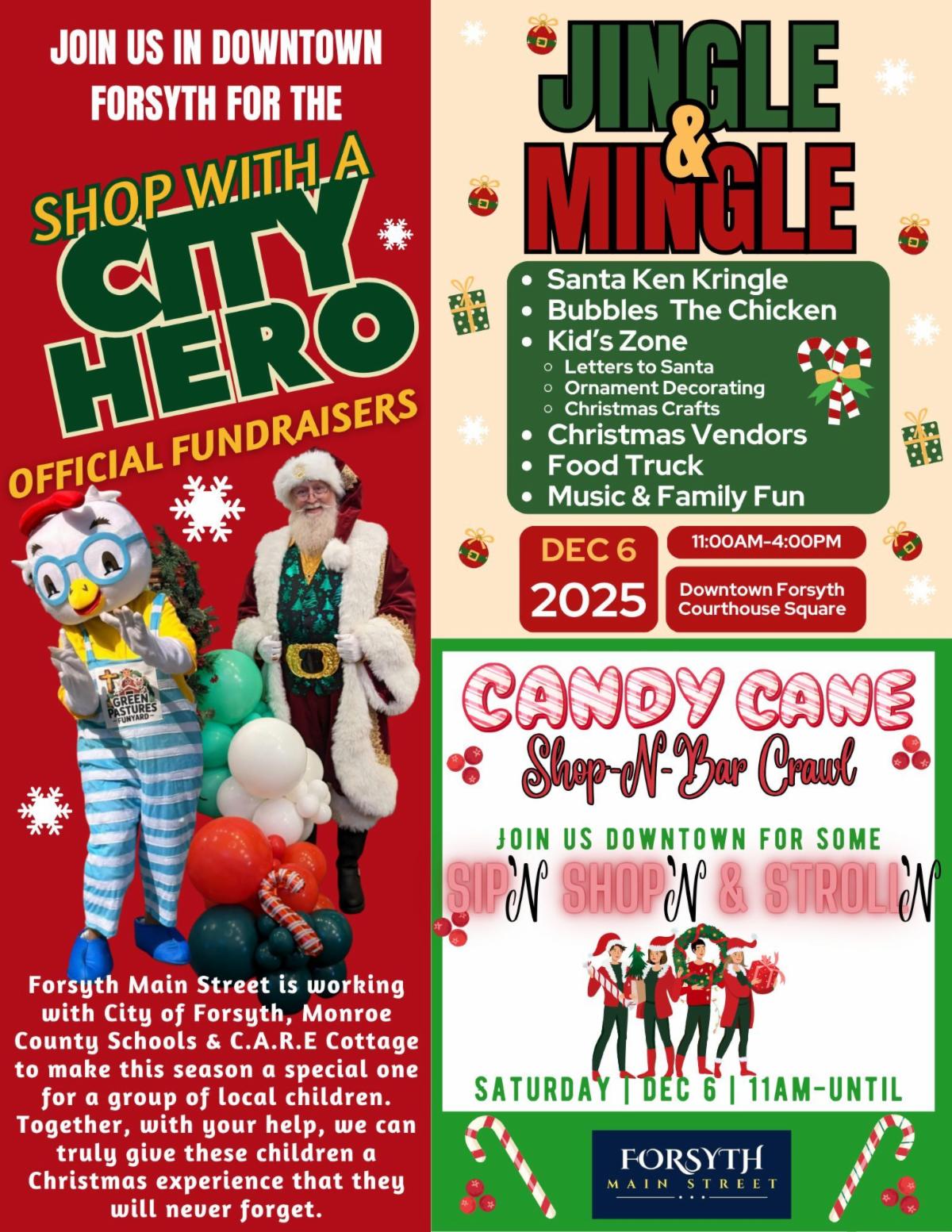 Join Main Street for a fun filled start to your holiday season! This event runs from 11AM – 4PM on Saturday, December 6, 2025 and will be held on the square in Forsyth. Proceeds benefit the Shop With A City Hero fundraiser.