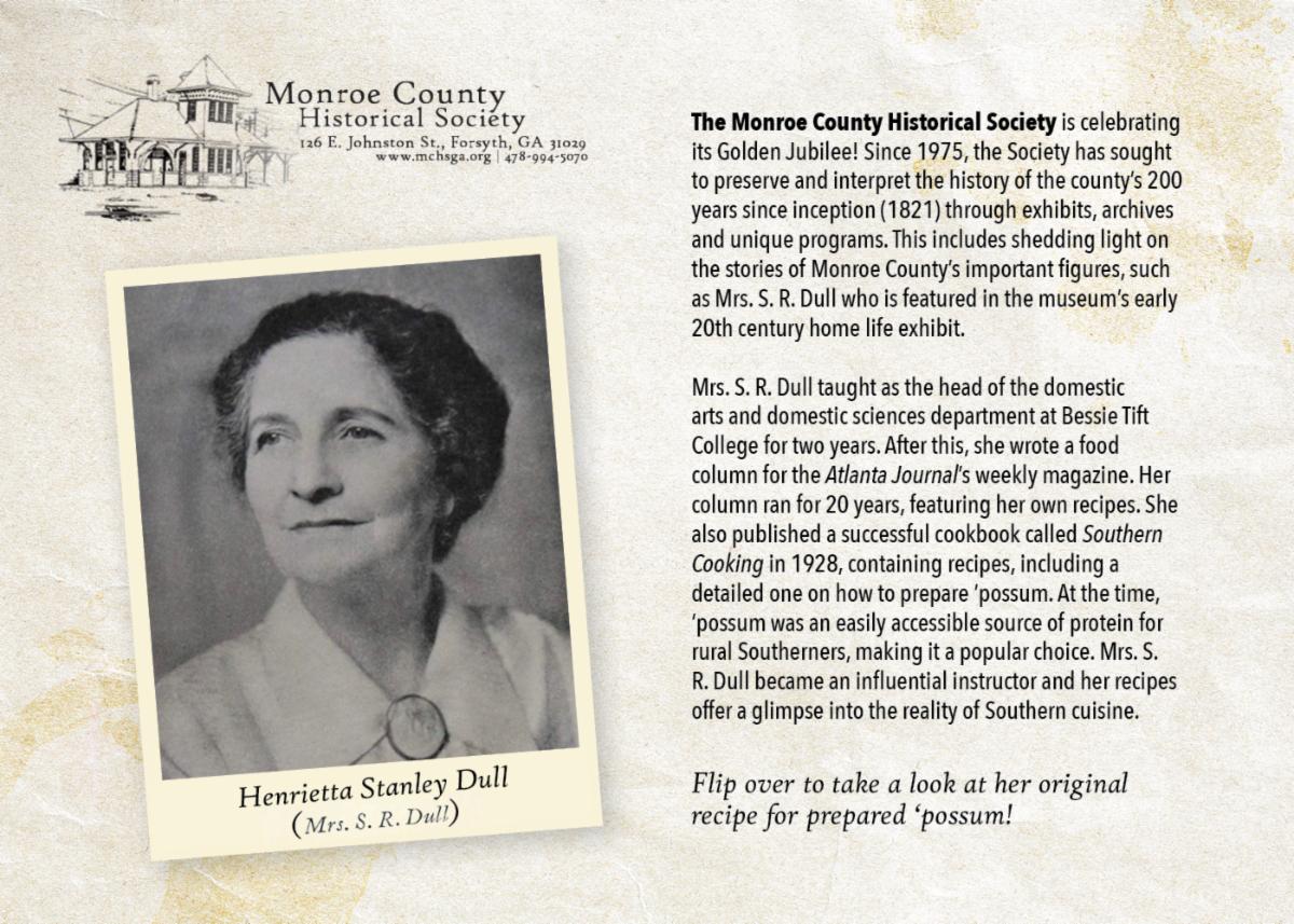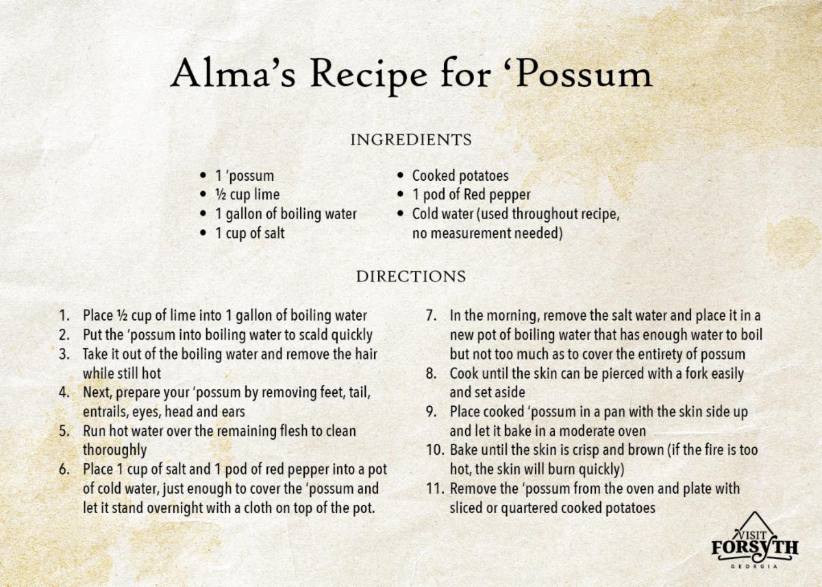 Among those recipes is hers for ‘possum, which you can pickup for yourself at the Monroe County History Museum or the Visit Forsyth Welcome Center!
