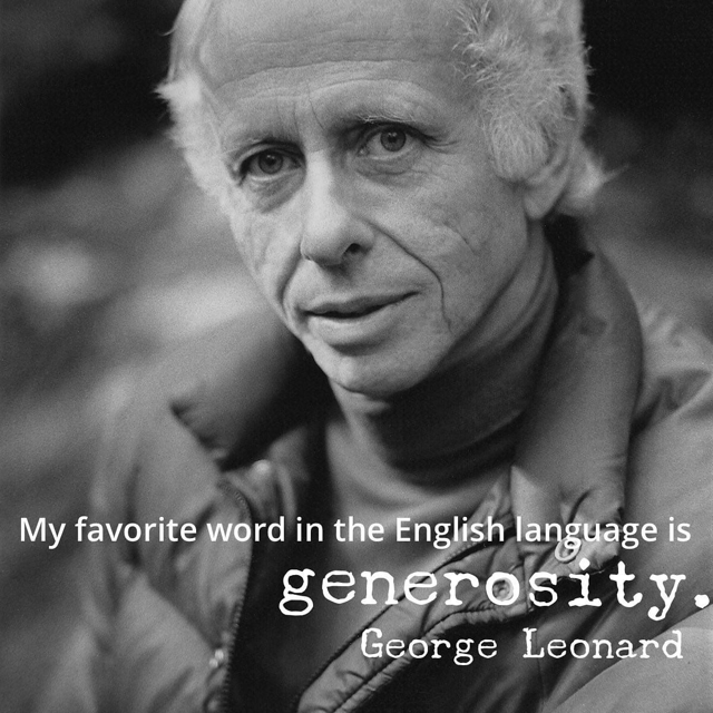 In this newsletter, we explore George Leonard's favorite word, Generosity, from a variety of angles. Allow yourself to soak in the power of that word and notice what's occurring when generosity is vivid inside you. Enjoy exploring the articles and clips on what generosity means to others and also for you.