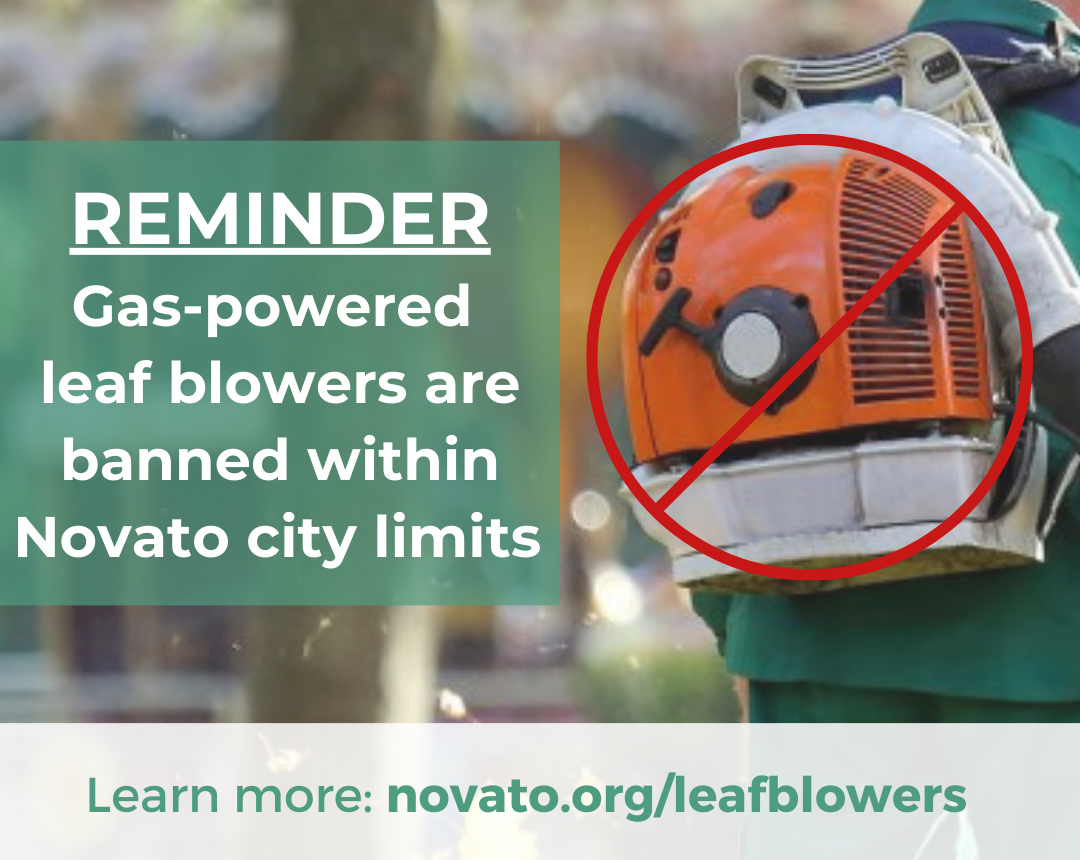 Gas-powered leaf blowers are banned within Novato city limits. Responsibility for ensuring that gas-powered leaf blowers are not used rests with the property owner who either uses, or permits the use of a leaf blower on their property.