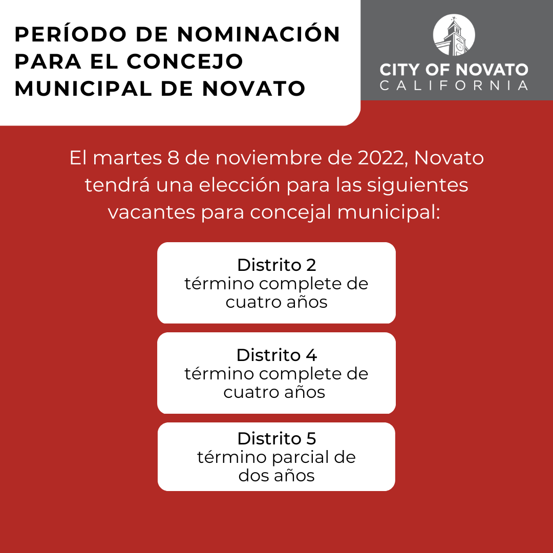 ¿Le interesa postularse para el Concejo Municipal de Novato? El período de nominación, en el cual los candidatos puede declarar su intención de postularse para estos distritos está abierto el 18 de julio de 2022 y cierra el 12 de agosto de 2022.