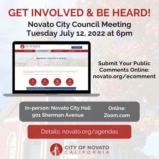 The Novato City Council meets tomorrow, 7/12, at 6pm at Novato City Hall, 901 Sherman Avenue and via Zoom.com.