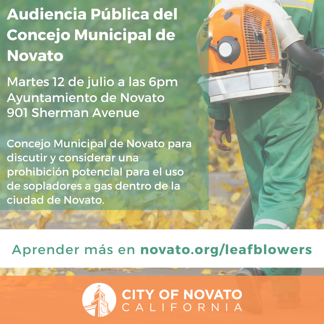 En su reunión regular el martes 12 de julio a las 6pm, el Concejo Municipal de Novato tendrá una audiencia pública para discutir y considerar una prohibición potencial para el uso de sopladores a gas dentro de la ciudad de Novato.