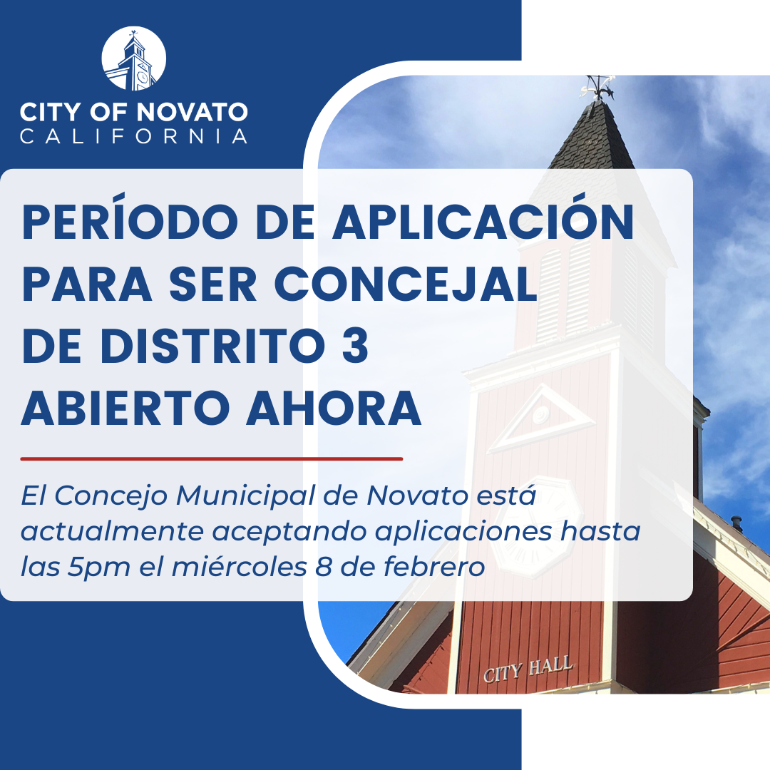 En su reunión regular el martes 24 de enero, el Concejo Municipal de Novato votó por unanimidad a empezar el proceso de nombrar un concejal municipal para llenar la vacante en Distrito 3 creado por la salida de Eric Lucan, quién ahora es un Supervisor para el Condado de Marin. La persona nombrada para llenar la vacante tendrá el puesto para el resto del período, que vence en diciembre de 2024.