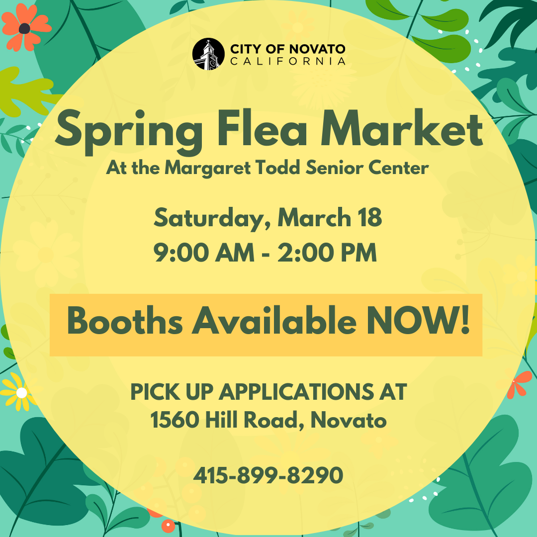 Make space in your home for the things that matter! The Margaret Todd Senior Center is hosting its Spring "Trash to Treasures" Flea Market on Saturday, March 18, 9am - 2pm. Sell your second-hand items by renting a booth from us for an affordable fee! Booths are sold on a first-come, first-served basis and space is limited, so be sure to reserve your spot! For more information, call 415-899-8290 or visit novatofun.org/events.