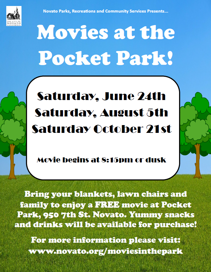 Movies at Pocket Park June 24, Aug 5 &