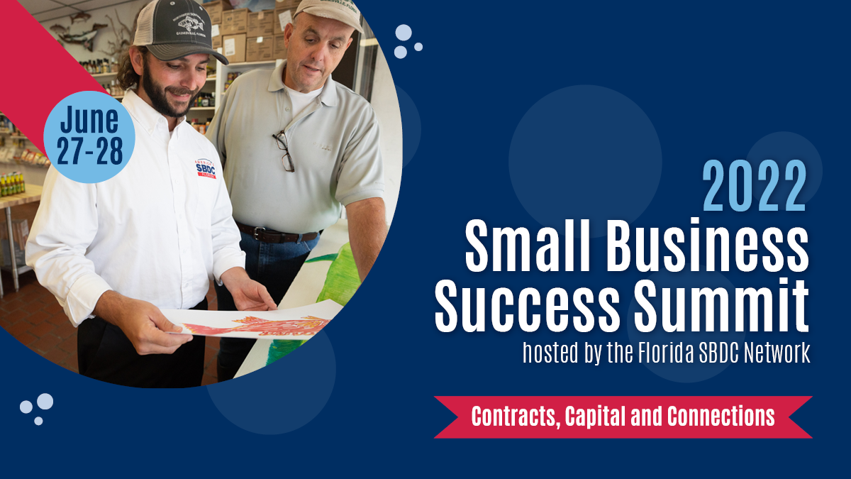 The Florida SBDC Network is excited to host the Small Business Success Summit, June 27-28, 2022 in Tampa, FL. to provide small businesses with access to capital, contracts and connections that encourage success and growth despite the major challenges they have faced following a global pandemic. Learn more here.