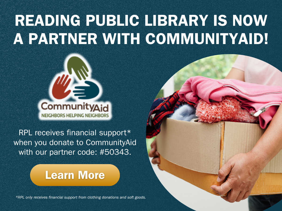 Reading Public Library is partnering with CommunityAid Thrift Store! The Reading Public Library Foundation receives financial support when you donate clothing or other soft goods to any CommunityAid store when you credit Reading Public Library Foundation or our partner code #50343 at the time of your donation.