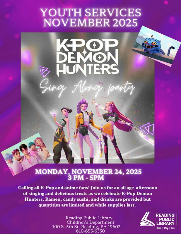 Calling all K-Pop and anime fans! Kick off your holiday break and join us for an all-age afternoon of singing and delicious treats as we celebrate K-Pop Demon Hunters. Ramen, candy sushi, and drinks are provided but quantities are limited and while supplies last.