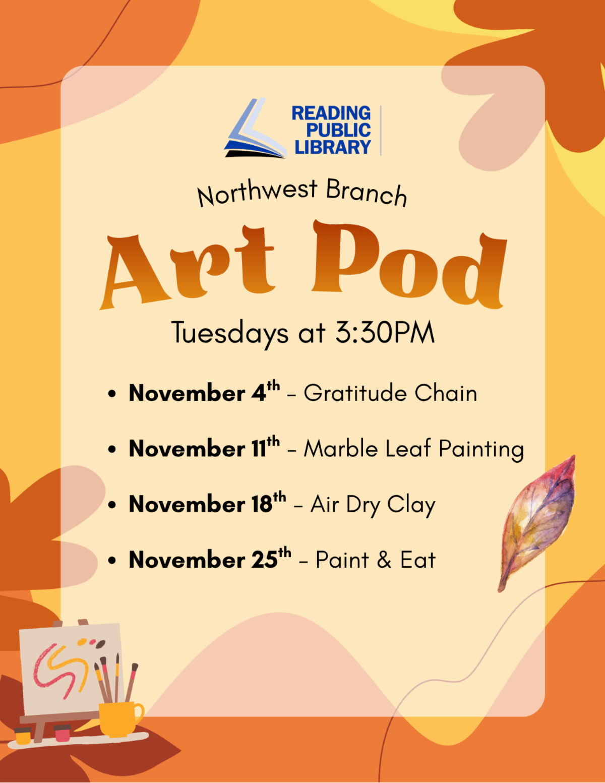 We have exciting STEM programs every Wednesday at 3:30PM at Northwest! Kids will have fun and exercise their minds while making gratitude chains, marble leaf paintings, clay crafts, and more.