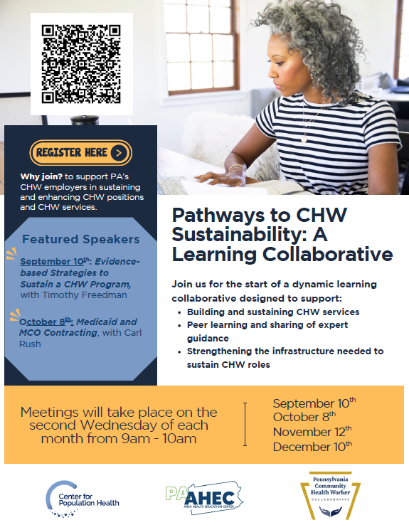 Center for Population Health, PA Area Health Education Center, and Pennsylvania Community Health Worker Collaborative have joined forces on "Pathways to CHW Sustainability: A Learning Collaborative."