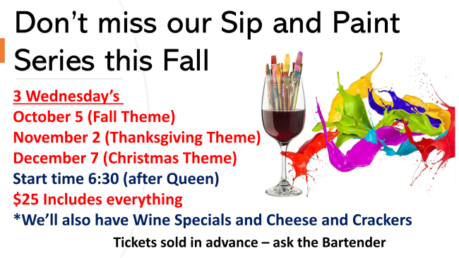 - The last Sip and Paint of 2022will be Wednesday DEC 7th - sign up now it's filling up!