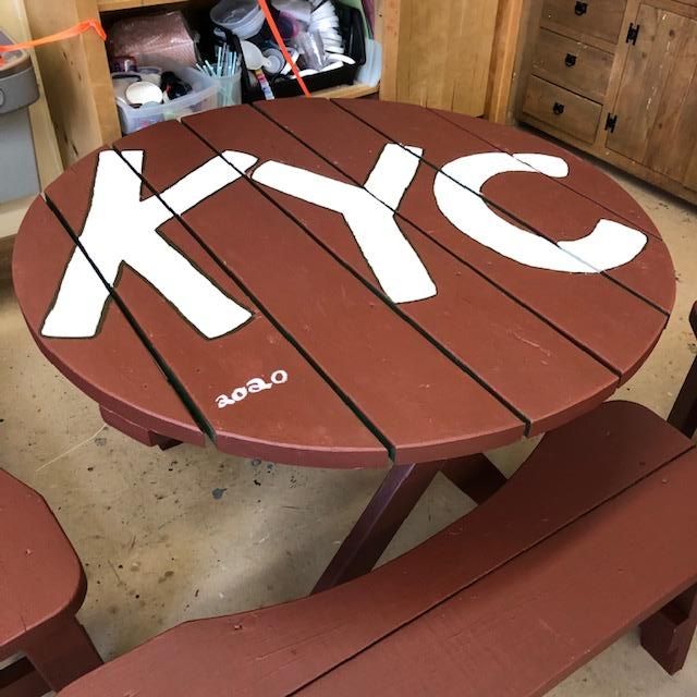 For our new tables, we chose to go with a natural look, finishing with clear stain. In refurbishing some tables that the KYC has had for over 10 years, we decided to get creative and show our KYC spirit! Below there is one ‘before shot’ and two ‘after shots’ of our completed work. These table now match our building, which is red with white trim.