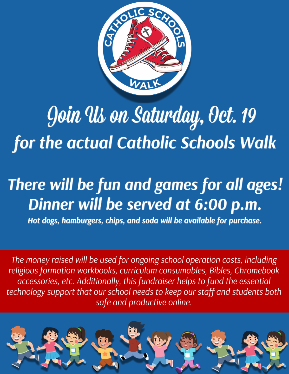 10/19 - Catholic Schools Walk & Dinner (After 4:30 p.m. Mass) - Sign up your walkers and create your fundraising page HERE