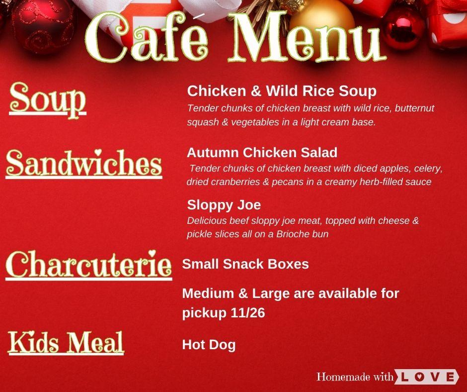 | Stop by for lunch! Items on the lunch menu will be made with love and from scratch by our own Chef Connie. | |