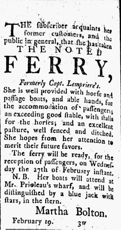 Following Lempriere’s death in 1778, it took his daughter some 20 years to settle her father’s estate, stark testimony to the difficult economic times which followed the Revolutionary War. Although she tried numerous times to sell her father’s properties, no sale of the Hobcaw Point (now known as Lempriere’s Point) ever materialized. In 1788, the ferry was leased to Martha Bolton, yet this business involvement lasted less than two years.