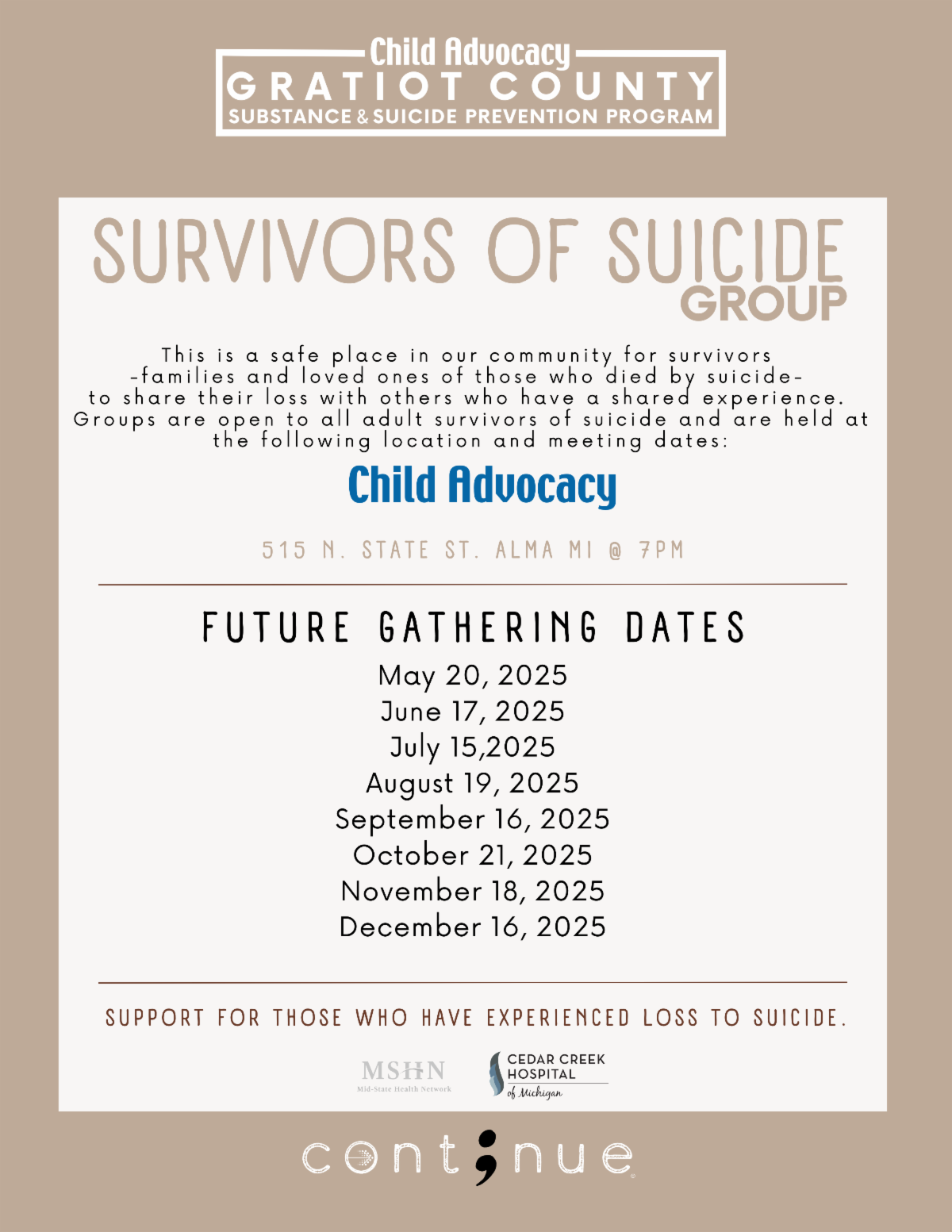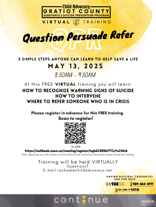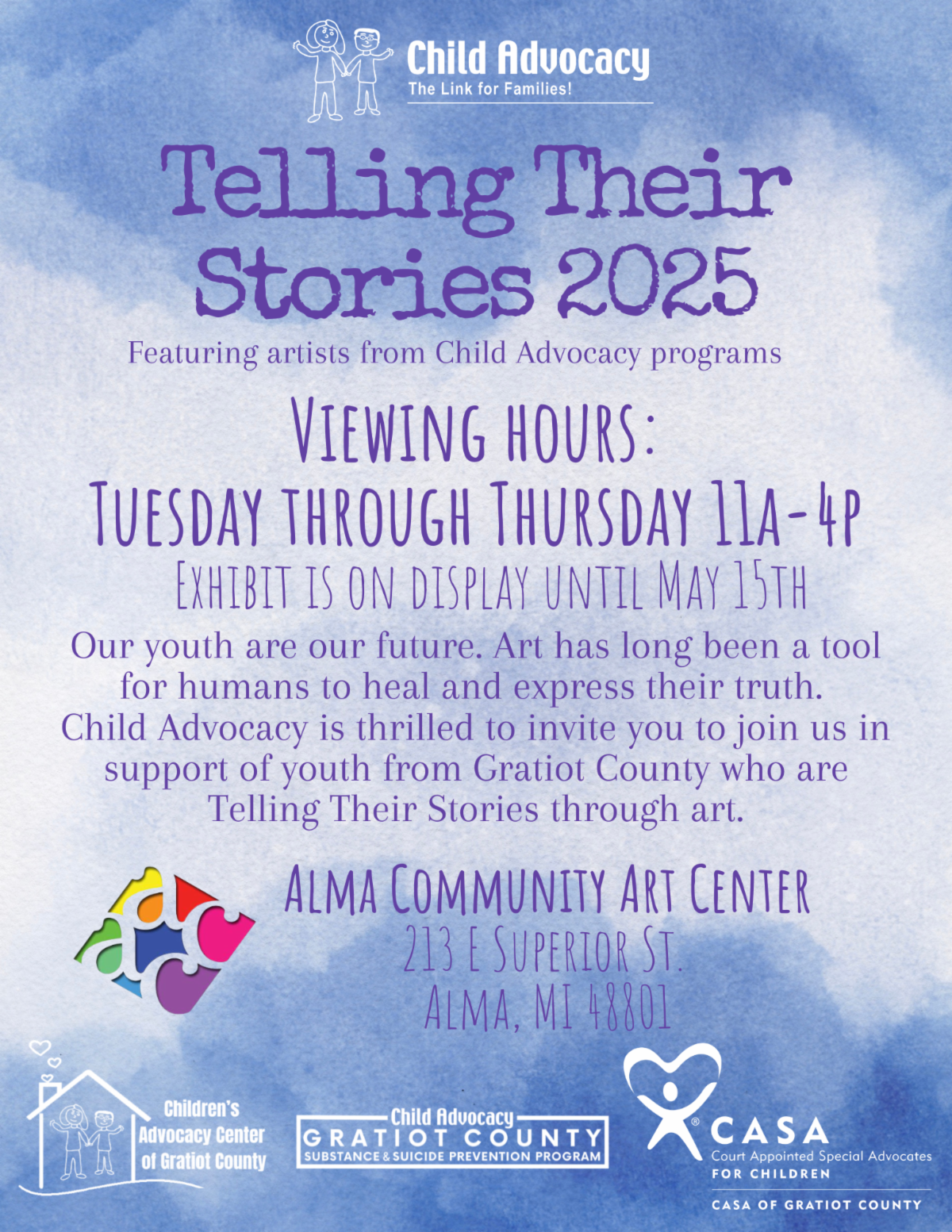 This meaningful art show will feature the talents of artists from Court Appointed Special Advocates, the Children’s Advocacy Center, and Above the Influence—a transformative program offered by the Gratiot County Substance & Suicide Prevention Program. Each piece will resonate with the emotions and experiences of its creator, showcasing the power of art as a medium for healing.