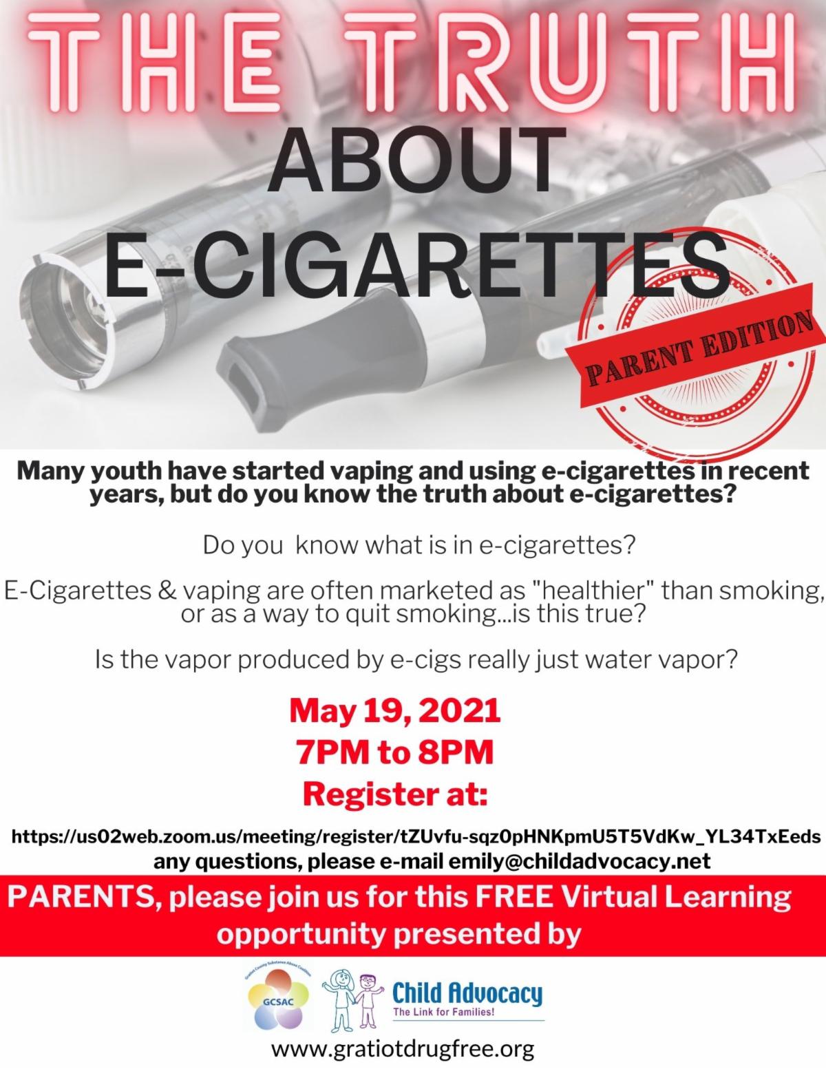 I will be hosting a Parent Edition of “The Truth about E-Cigarettes” on May 19th at 7:00pm via Zoom, though it says Parent Edition, all are welcome.