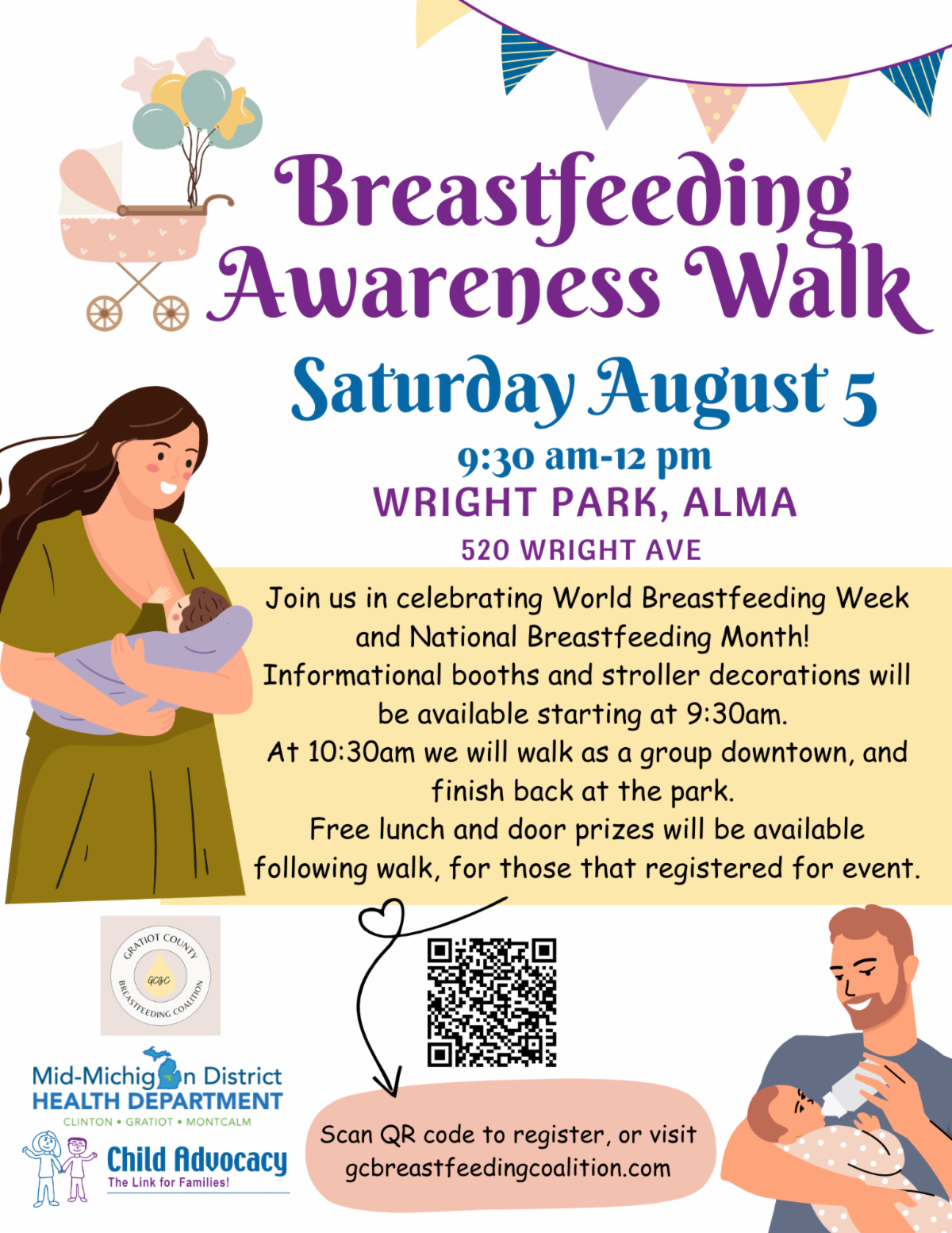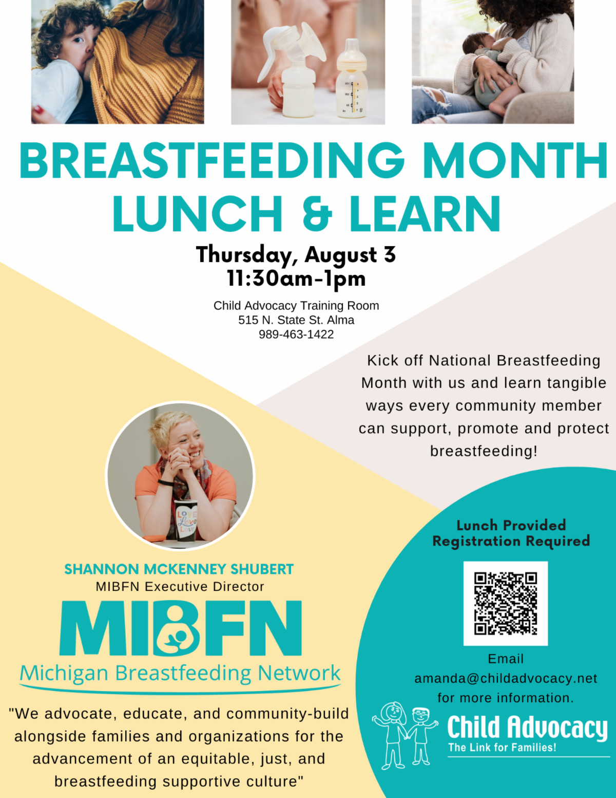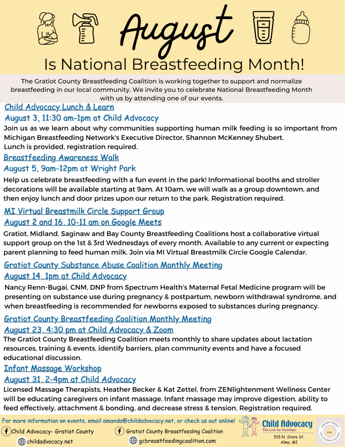 The Gratiot County Breastfeeding Coalition (GCBC) is excited to be celebrating our first year this August! The GCBC was established in September of 2022, as a program of Child Advocacy, to collaborate with local organizations and families in creating a more breastfeeding-supportive culture in our community. The coalition meets once a month to share updates on lactation resources and trainings, identify barriers, discuss a relevant educational topic, and plan community events. Meetings are open to anyone who wishes to learn more about how to improve breastfeeding support in our community, and are regularly attended by staff from Child Advocacy, Mid-Michigan District Health Department, MyMichigan Health, Gratiot Integrated Health Network, local doulas, community lactation supporters, and parents. Our educational topics this past year have included presentations about human milk in the NICU, the Infant Mental Health services provided by GIHN, the impact of tethered oral tissues on breastfeeding, WIC, Infant Safe Sleep, the role of doulas in supporting families, and the services provided by Eight Cap & 0-5 Head Start. Monthly meetings are held on the fourth Wednesday of every month at 4:30 p.m., in the Child Advocacy Training Room as well as Zoom.