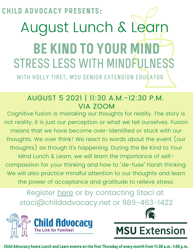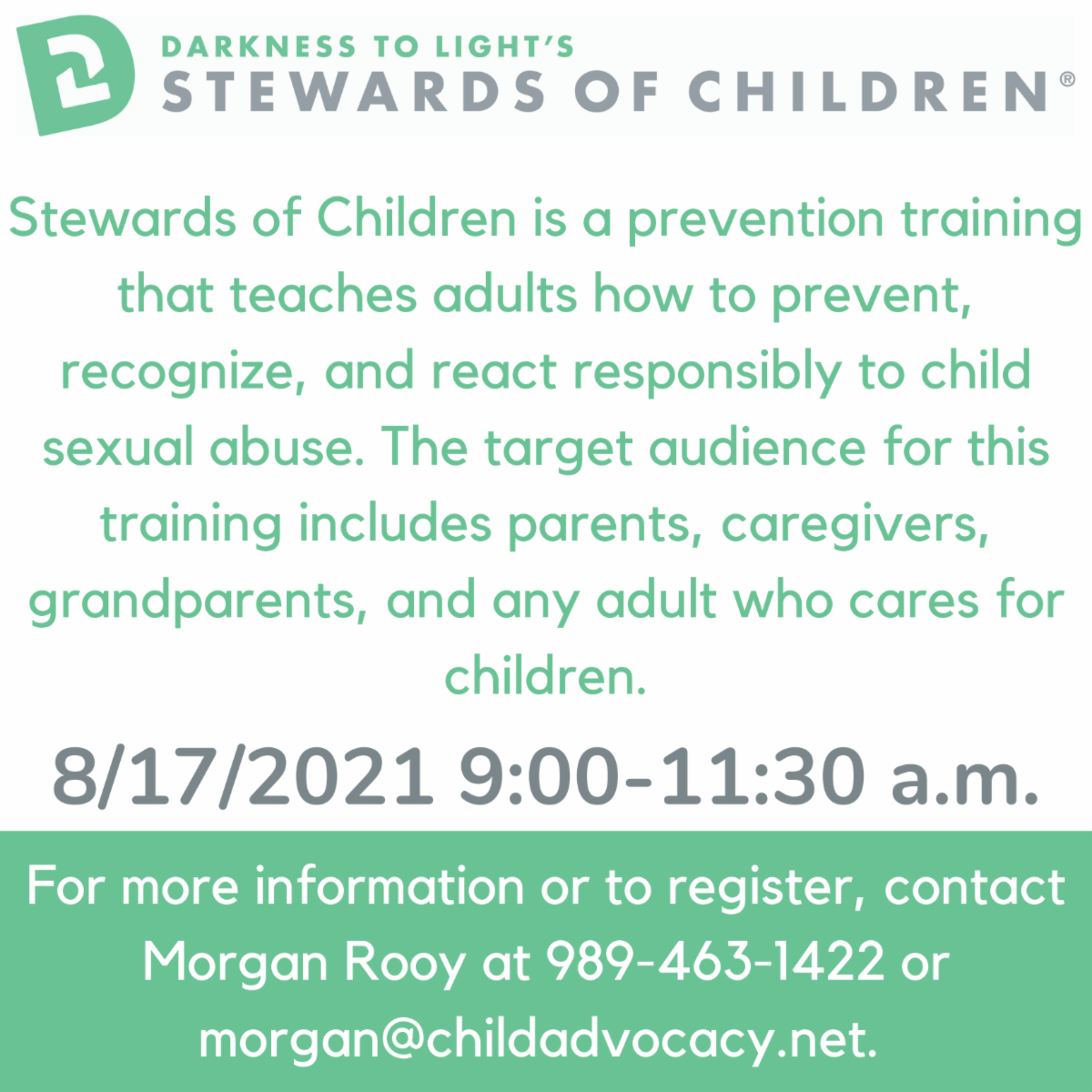 Registration required and limited to 15 participants. Contact Morgan Rooy at 989-463-1422 or morgan@childadvocacy.net to reserve your space.