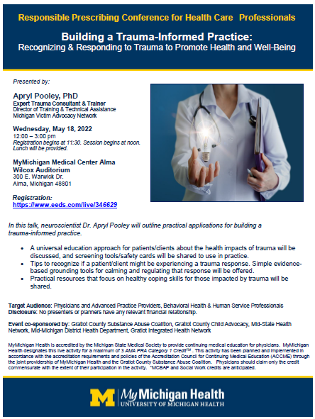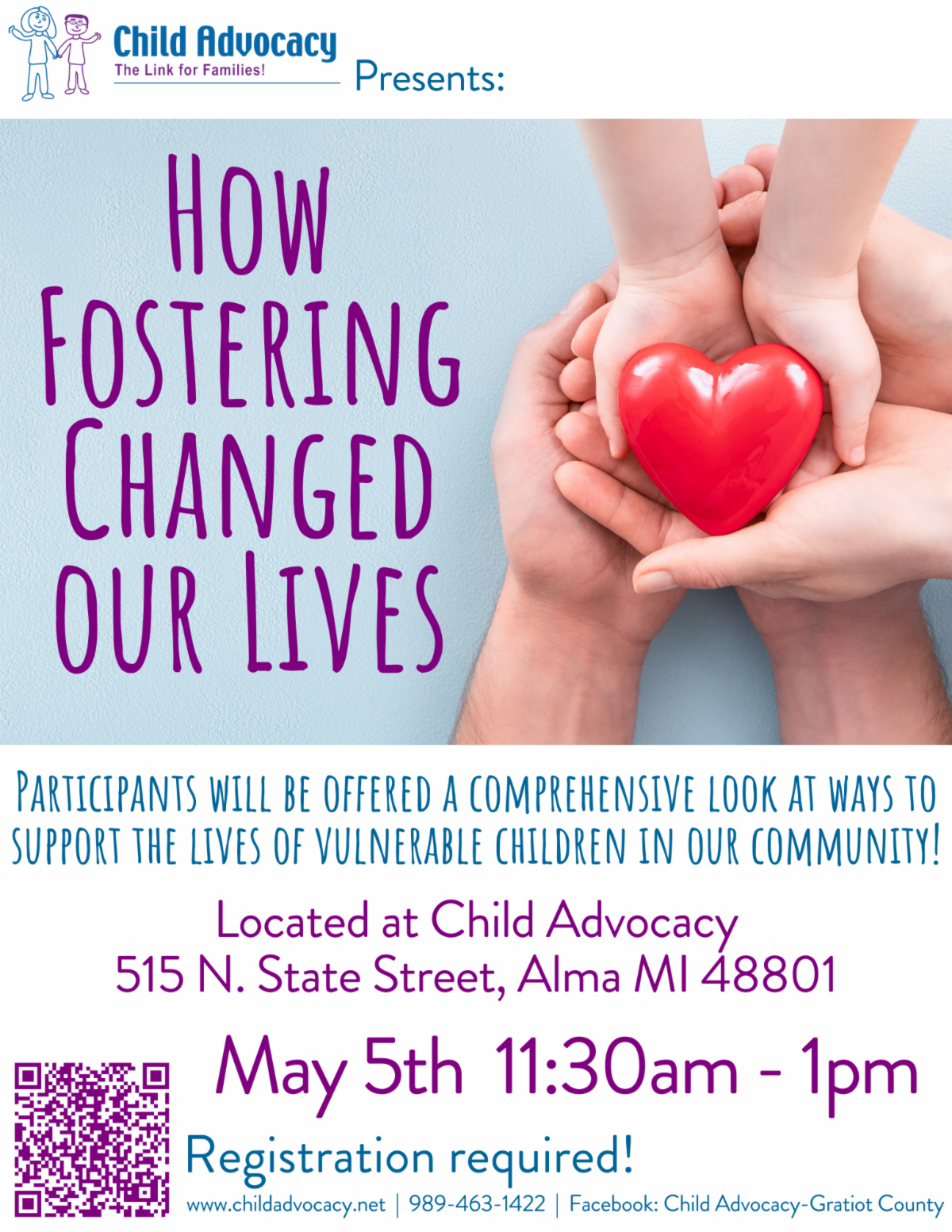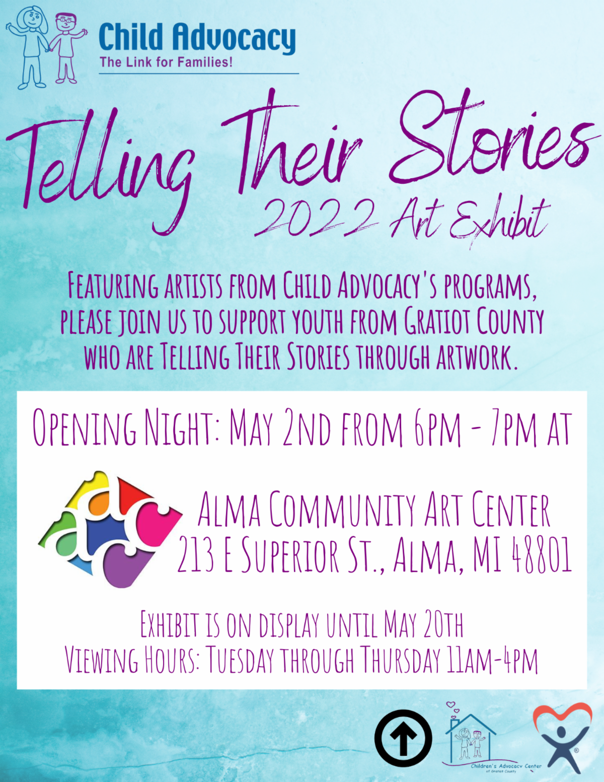 We invite the community to support youth who are Telling Their Stories by attending our opening reception on May 2, 2022 from 6pm – 7pm at the Alma Community Art Center located at 213 East Superior Street. The show will remain on display at the Art Center until May 20, 2022 where you can view artwork Tuesday, Wednesday and Thursday from 11am – 4pm. For more information, please call Child Advocacy at (989) 463-1422.
