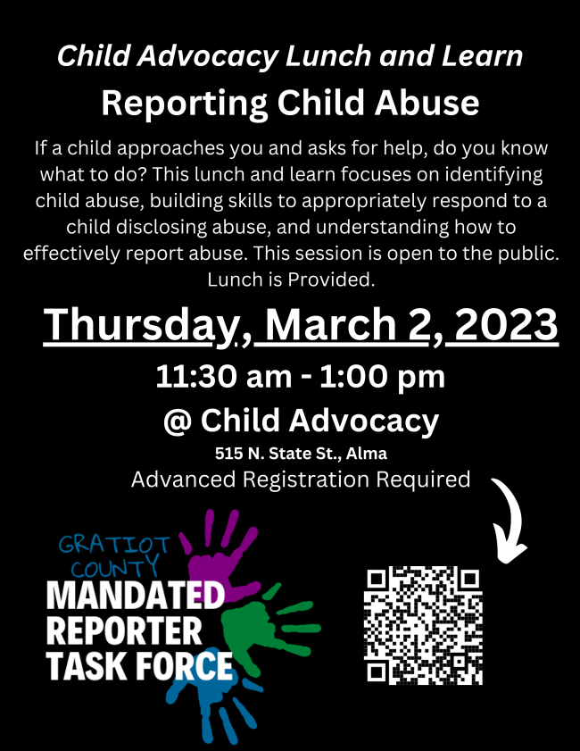 In August of 2022, Child Advocacy and the Michigan Department of Health and Human Services (MDHHS) developed the Gratiot County Mandated Reporter Task Force. This was in response to an increase in child abuse allegations in our county since the COVID-19 Pandemic. Members of the Task Force offer the MDHHS Mandated Reporter Training to the community at no cost. This hour-long training is facilitated by both a local MDHHS staff in partnership with a Child Advocacy staff. It provides individuals with the necessary tools to not only recognize child abuse and neglect, but help them to build skills to appropriately respond to a child reporting abuse, and gain confidence with the reporting process. Mandated reporters are an essential part of the child protection system because they have an enhanced capacity, through their expertise and direct contact with children, to identify suspected child abuse and neglect.