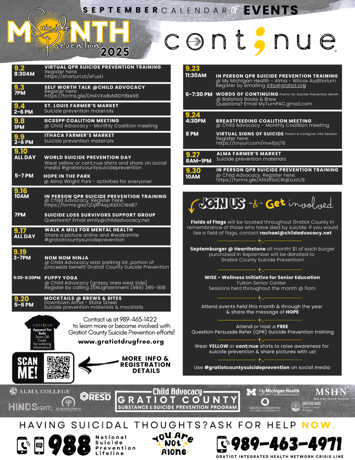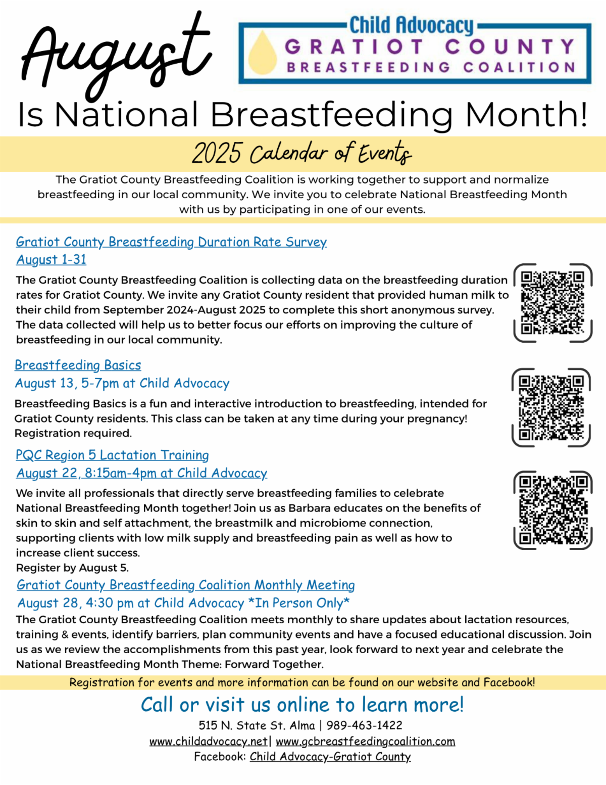 Locally, the Gratiot County Breastfeeding Coalition is focusing their efforts to encompass both themes to honor both breastfeeding families and the professionals that support them. This year we are introducing the first Gratiot County Breastfeeding Duration Rate Survey, intended for any Gratiot County resident that provided any amount of breastmilk to their child (direct from breast, pumped milk, or donor milk) at any time from September 1, 2024 - August 31 2025. This survey was developed so that we can gather more detailed information about the experiences of breastfeeding families in Gratiot County. The information collected will support our efforts in promoting and supporting breastfeeding in our local community. Breastfeeding Basics, a quarterly in-person prenatal breastfeeding education class will be available for expectant families on August 13, and professionals throughout the region will gather together at Child Advocacy to expand their knowledge at the PQC Region 5 Lactation Training. The Gratiot County Breastfeeding Coalition will honor the month together at our monthly Coalition meeting and celebrate all that we have learned and accomplished this past year!
