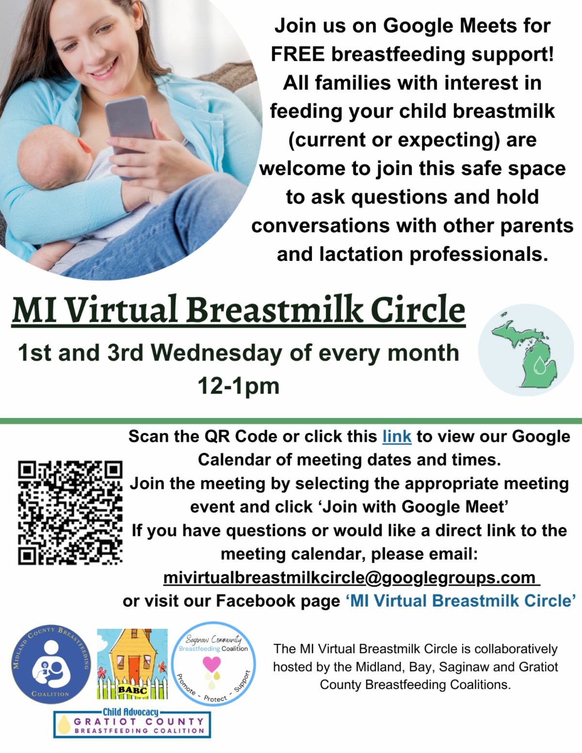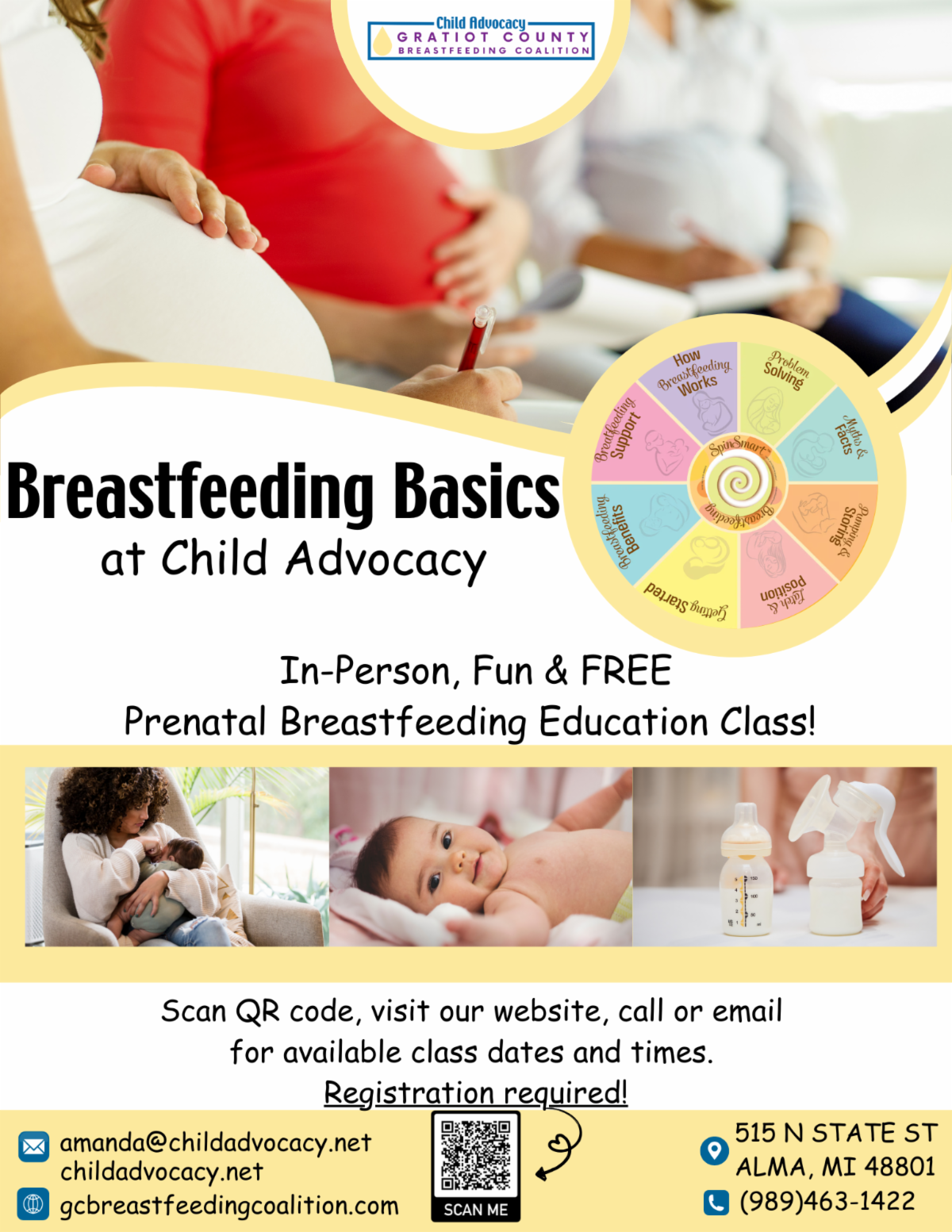The Gratiot County Breastfeeding Coalition hosts monthly meetings on the fourth Wednesday of every month at 4:30pm. Meetings alternate between a focus on educating our community, and planning for future promotion and duration strategies. If you are interested in becoming involved in the Gratiot County Breastfeeding Coalition, or would like more information about any of the lactation support services available in our community please email -