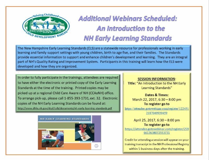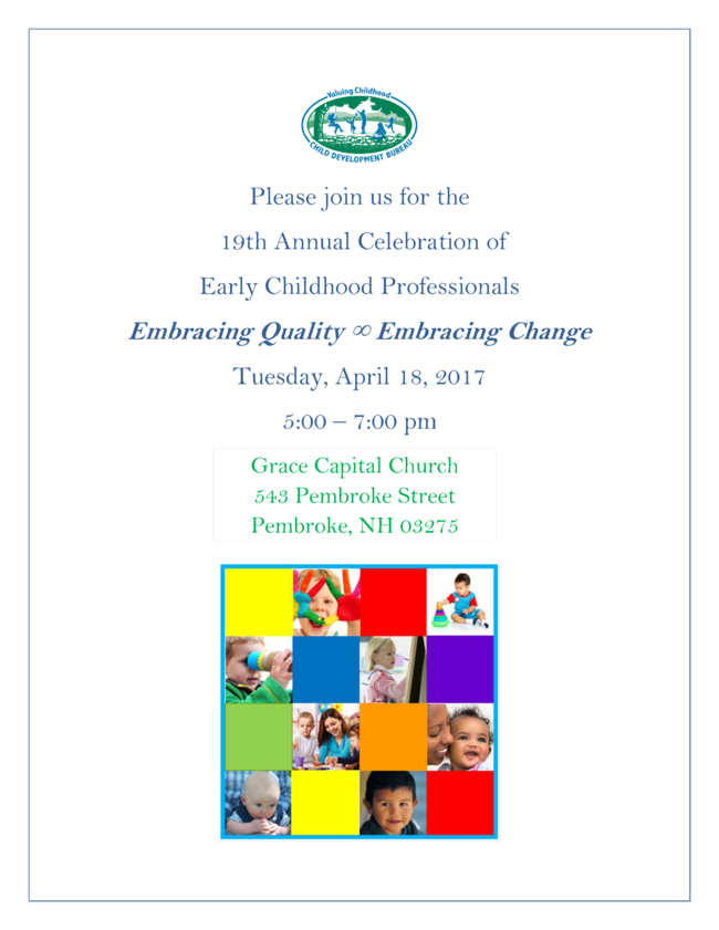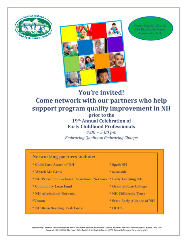 Please note that Child Care Aware of NH will disseminate this information once through the next available e-newsletter depending upon the date sent. Submissions must be email ready and should be sent to