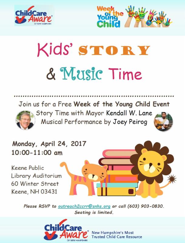 Child Care Aware of NH will be holding a Week of the Young Child Event on Monday, April 24th in Keene.