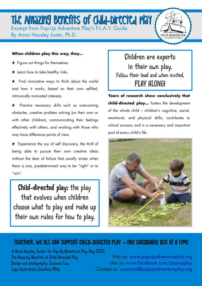Click on the resource above from Pop-Up Adventure Play to download a copy. PUAP is a non-profit organization that believes that children’s play is both a sign and catalyst for healthier individuals, families and communities. A person’s best memories are often the most simple – a muddy puddle, a tree for climbing, a box fort with friends. They help adults provide opportunities for children to have such play adventure experiences now. | |