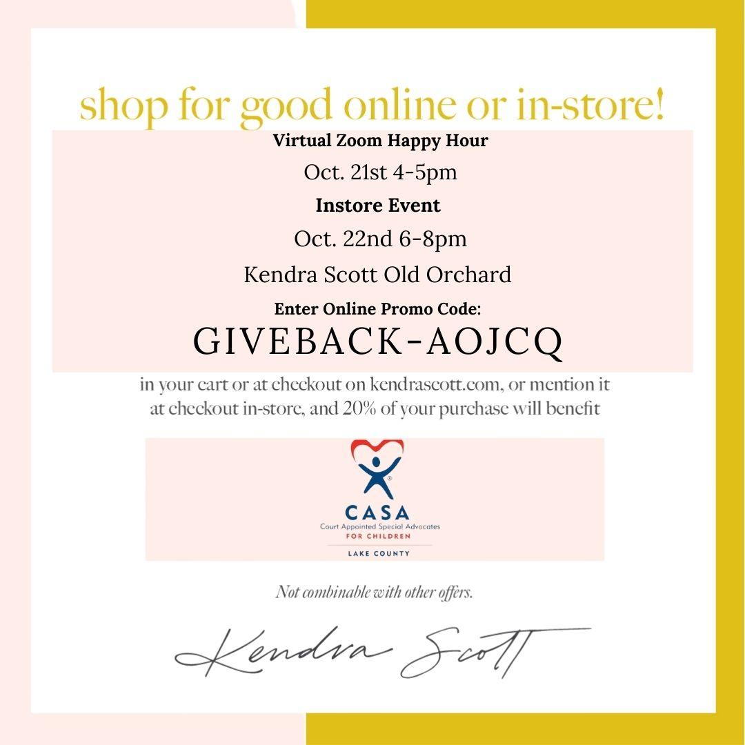 Kendra Scott is partnering with CASA Lake County on October 21st and 22nd. CASA will host a Zoom jewelry party today, Thursday the 21st, and for any purchases made there, each purchase made online, and at Kendra Scott in Old Orchard mall, 20% will be donated back to CASA. Here's your chance to shop and feel great about it!