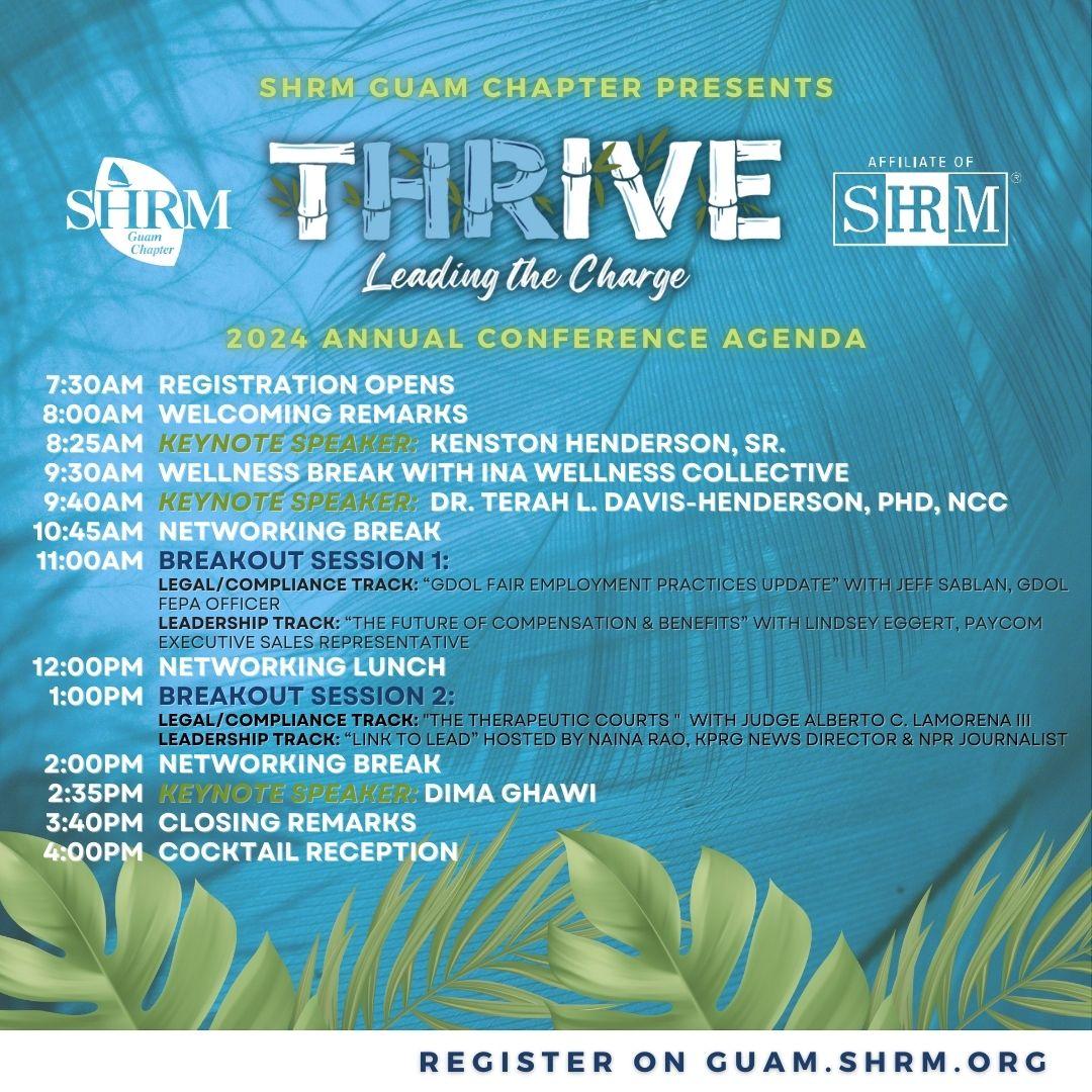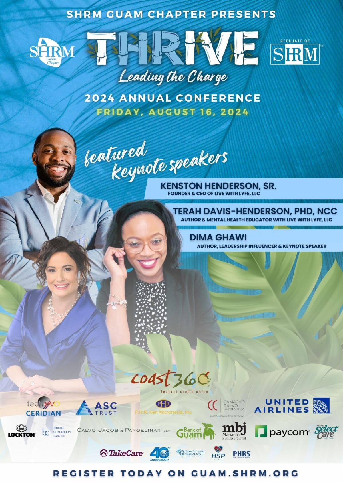 SHRM Guam Chapter Presents its 2024 Annual Conference themed THRIVE, Leading the Charge scheduled for Friday, August 16, 2024. This event will take place at the Dusit Thani Guam Resort and will feature Kenston Henderson, Terah Davis-Henderson, and Dima Ghawi. This is your last opportunity to register for this event! Click here to register and view event timeline!