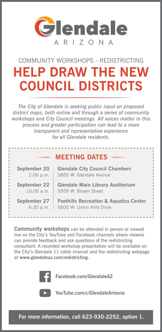 Glendale’s Foothills Recreation and Aquatics Center will be closed Labor Day. The Glendale Adult Center will be closed Labor Day and will reopen at 8 a.m. Tuesday, September 7. For more information about Parks and Recreation services and programs, call 623- 930-2820.