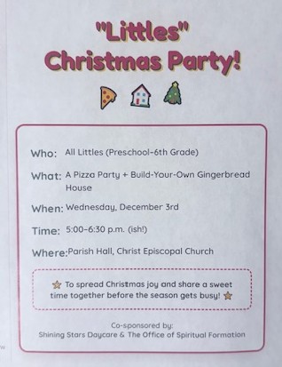 Calling all world-class cookie bakers of Christ Episcopal Church. Lessons and Carols will be on Dec 21 at 6:00 PM. Please consider this magnificent event in your cookie planning for Christmas. We need lots of cookies and truly appreciate your cookie donation as we also recognize the cost of cookie baking today! Please bring the cookies either to the office (Monday-Friday 9:00 AM - 2:00 PM) or on Friday, Saturday, or Sunday mornings; cookies can be left in the kitchen.